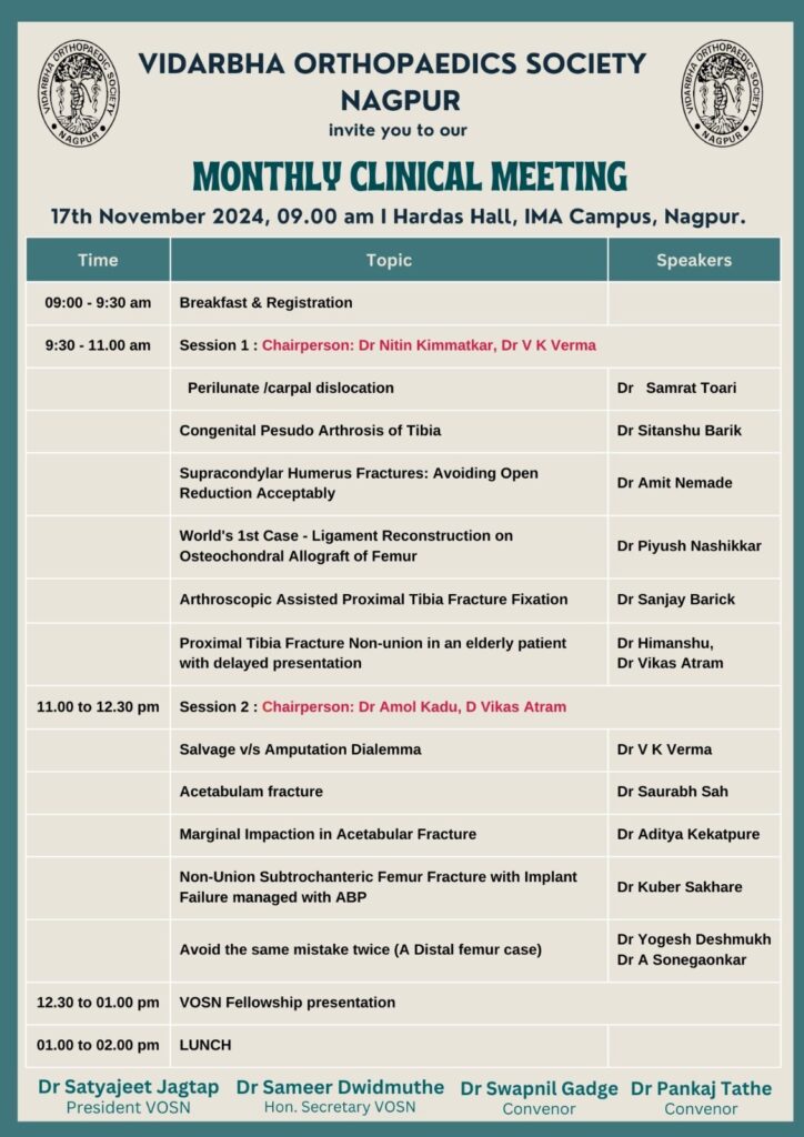 A successful clinical meeting was organized by the Vidarbha Orthopaedic Society Nagpur team, which featured an insightful discussion of eleven clinical cases. The meeting provided a valuable platform for knowledge exchange and professional development among medical practitioners.